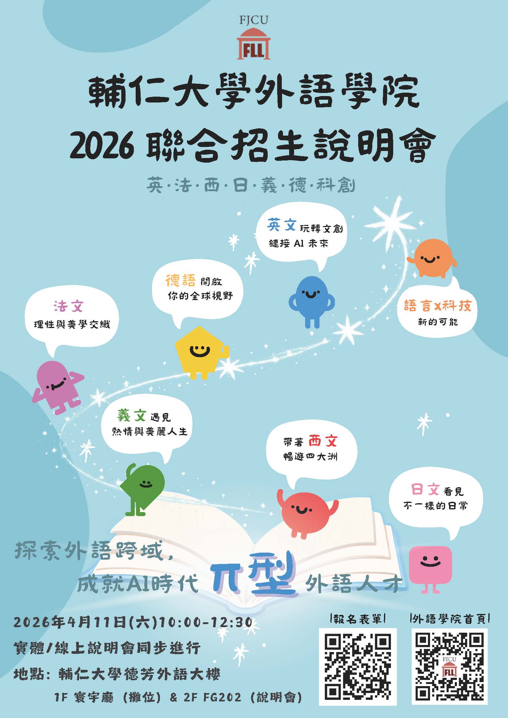 別擔心,輔大外語學院各系與科創學程將在 4月11日(六)10:00-12:30 舉辦聯合招生說明會,實體與線上同步進行,誠摯邀請考生與家長一同參與!