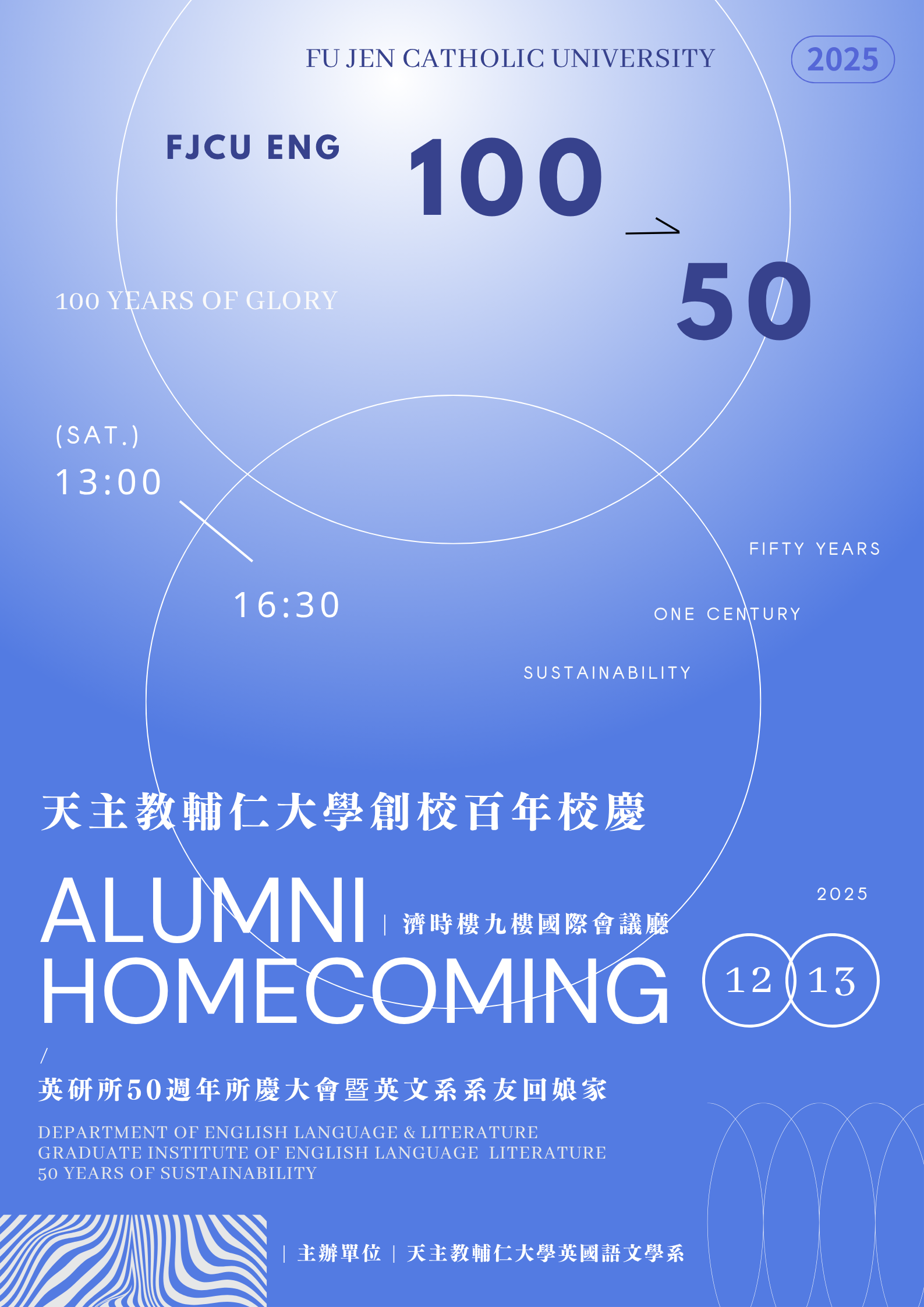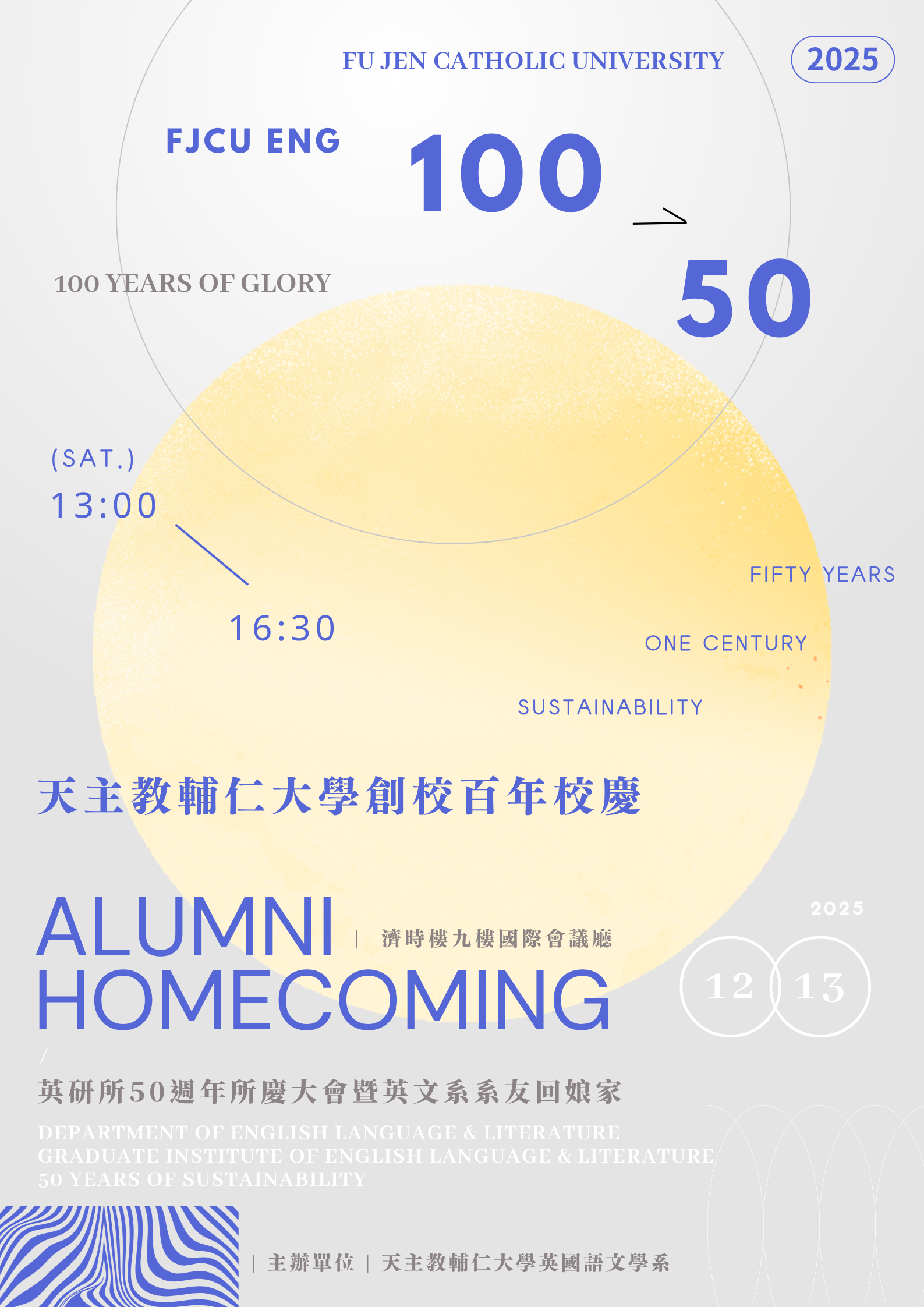 2025 年,輔仁大學迎來創校百年慶典,同時也是英國語文研究所(英研所)成立五十週年。這是英研所自 1975 年創立以來的重要里程碑——五十年來,無數學者、教育家與專業人才從此啟程,在教育、文化、語言研究及創意產業領域綻放光芒。英研所與英文系共同見證了輔仁大學英語教學與人文精神的發展歷程,也深刻形塑了校內外的國際交流與文化傳譯傳統。